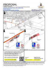 NOTICE IS HEREBY GIVEN that Cornwall Council proposes to introduce traffic calming measures (priority buildouts) under the provisions of Sections 90G-I of the Highways Act 1980. These measures are being introduced to improve the highway. The effect will be to reduce vehicle speeds and improve the safety of all road users along the lengths of road described below.
