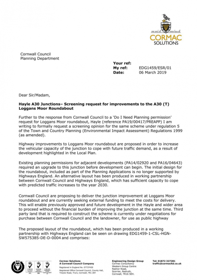 - PA19/02040 | EIA screening request for highway improvements to Loggans Moor roundabout - Hayle A30 Loggans Moor Roundabout