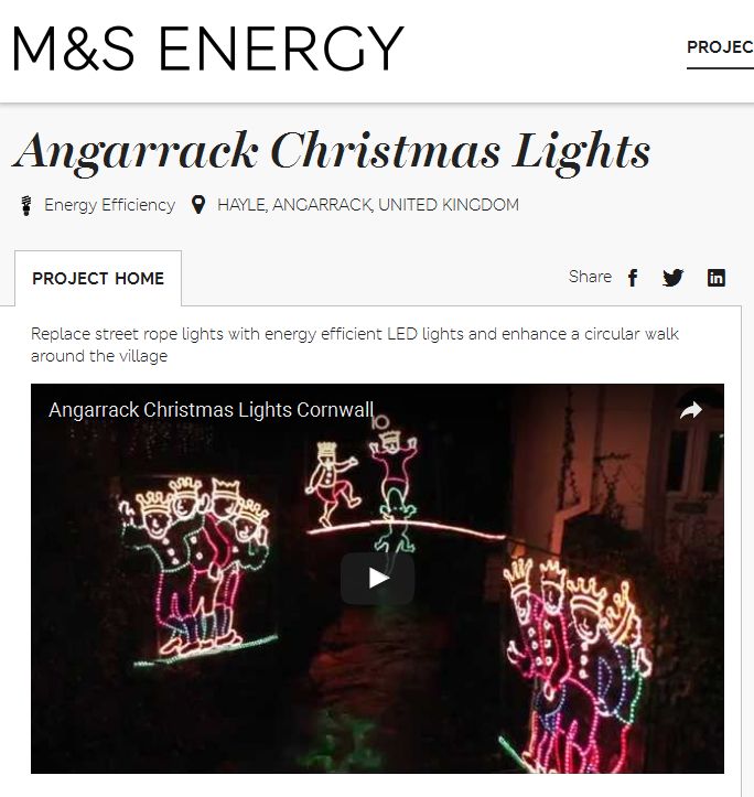 We are a community group which is solely funded by donations. The project started almost 30 years ago when a small group of villagers put up a few Christmas lights. It has since grown and now covers the whole village of Angarrack, Cornwall, with most villagers joining in. We need to raise money each year to cover the costs of maintenance, repairs, insurance and electricity. These are met by donations from the many visitors who come each year to see the displays but we can not afford to buy large items, such as rope strings to light a circular walk around the village. We need to buy about 1000m of rope light to complete the walk. We would like to replace the old rope strings with energy efficient LED lights.