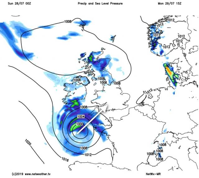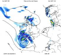 "Thunderstorms and outbreaks of heavy rain will arrive across the far south-west early on Tuesday, then spreading further north-east across England and Wales and increasing in frequency during the day.