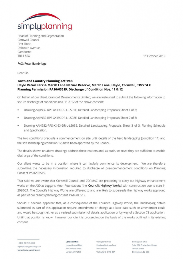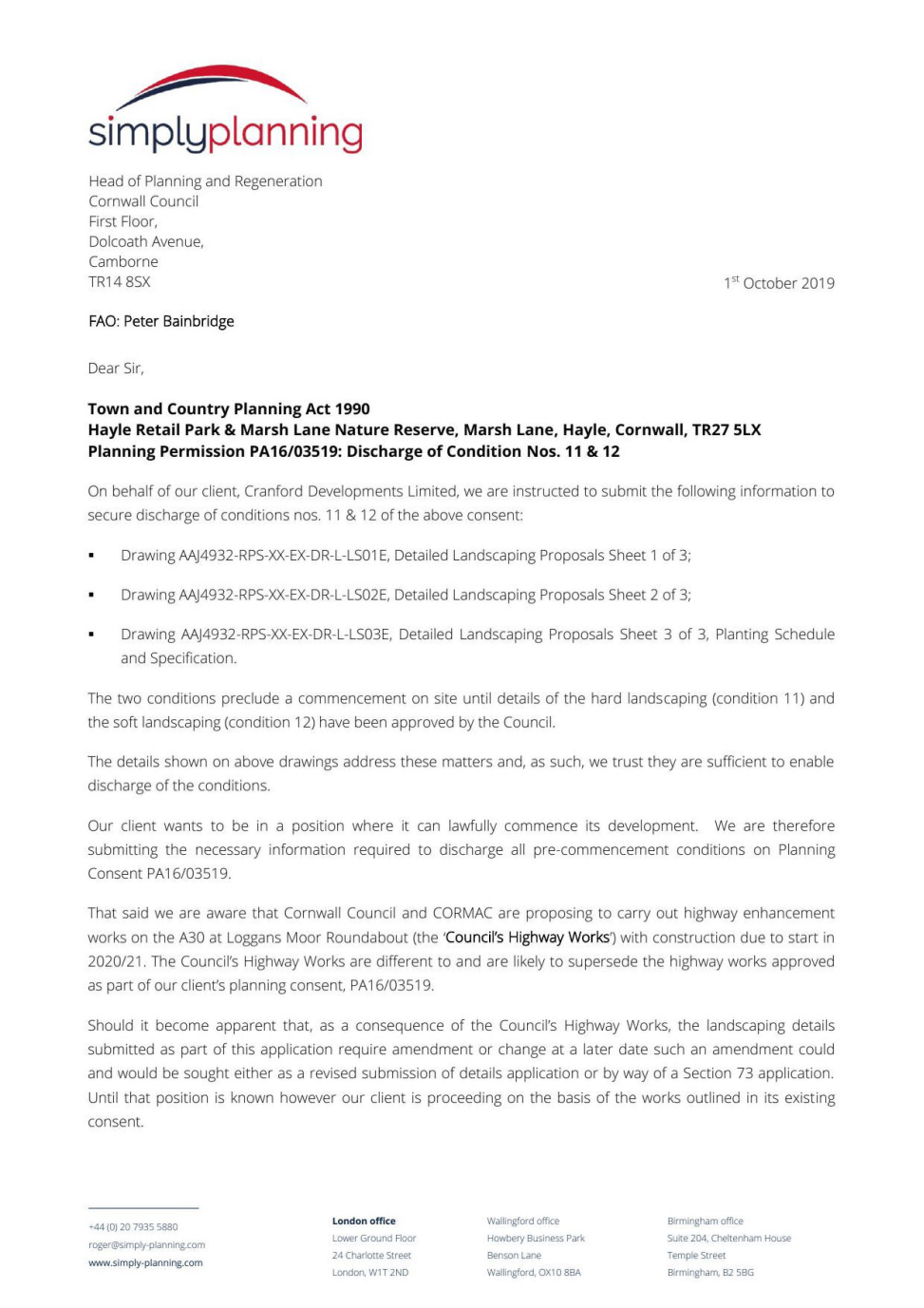 - PA19/08611 | Submission of details to discharge conditions 11 and 12 in relation to decision notice PA16/03519 - Hayle Retail Pa