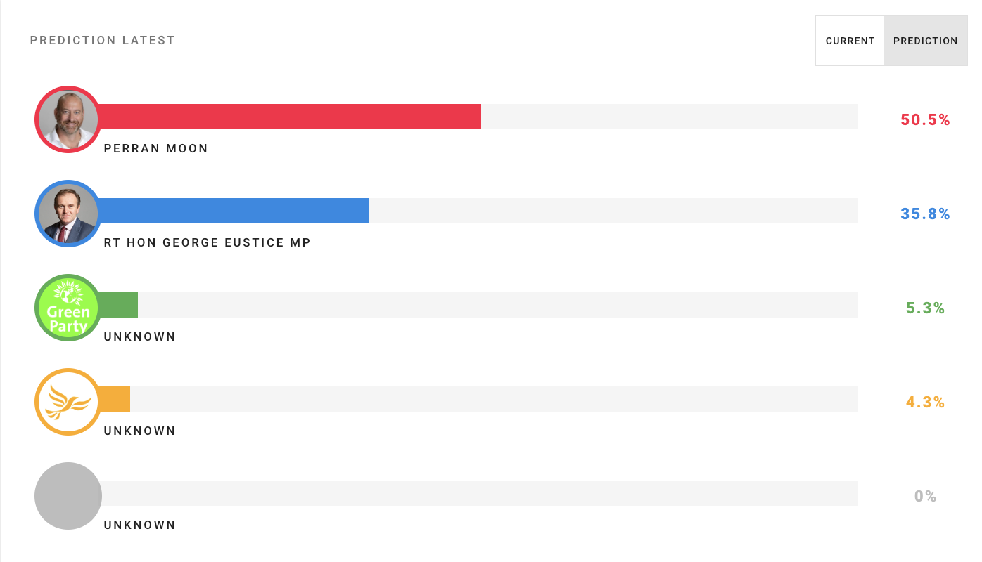 On national swing, according to our model, Eustice is set to lose out to Labour's challenger Perran Moon. The current swing is expected to be around 16%, with Moon securing a 15% majority in a seat which had previously been Conservative. His successor certainly faces a difficult challenge.