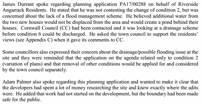 James Durrant spoke regarding planning application PA17/00288 on behalf of Riverside Angarrack Residents. He stated that he was not contesting the change of condition 2, but was concerned about the lack of a flood management scheme. He believed additional water from the two new houses would not be displaced from the area and would create a pond behind their houses. Cornwall Council (CC) had been contacted and it was looking at a drainage scheme before condition 6 could be discharged. He asked the town council to support the residents’ views (see Appendix C) when it gave its comments to CC.