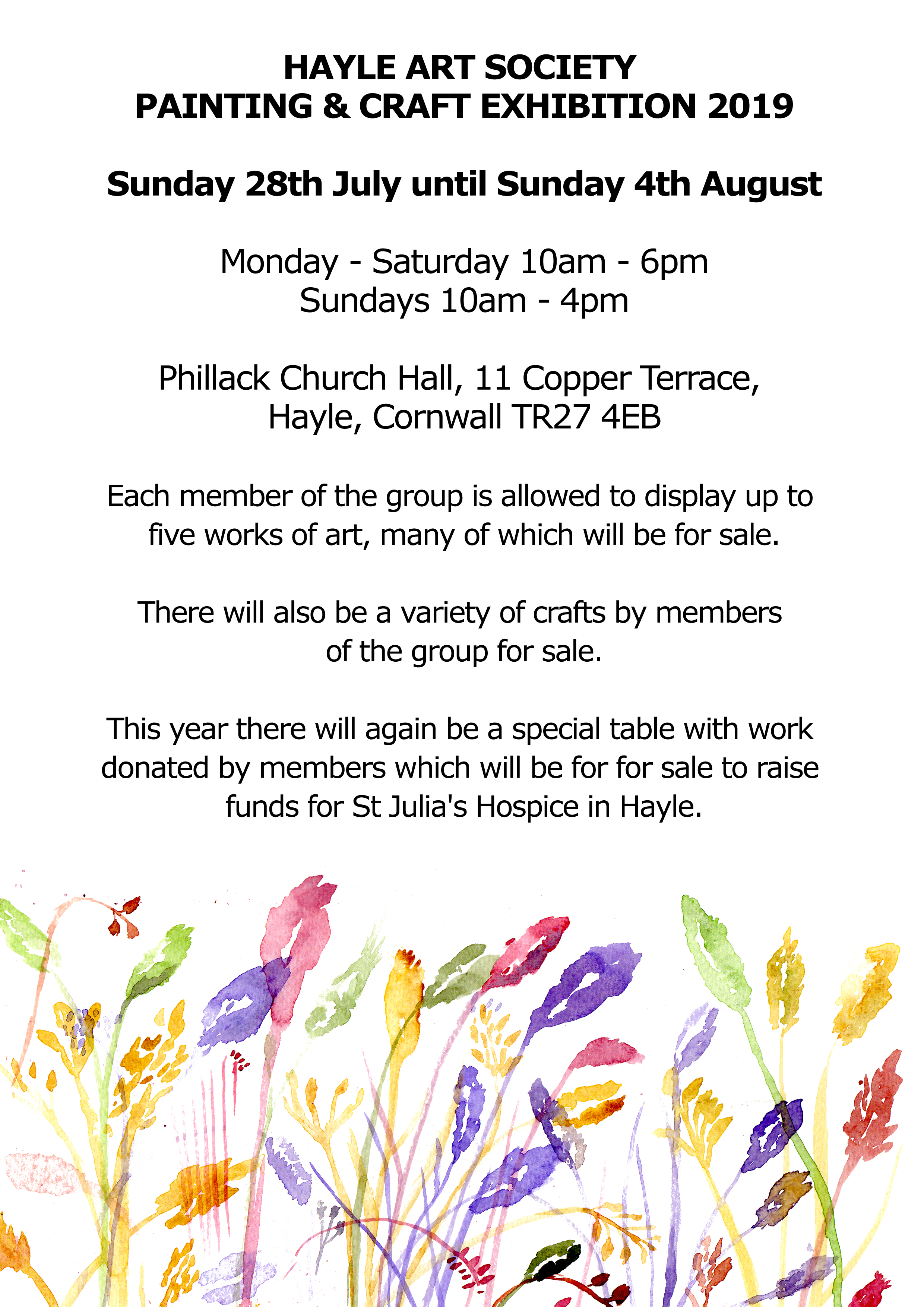 HAYLE ART SOCIETY is holding their annual exhibition at Phillack Church Hall until 4th August. The exhibition will be open daily from 10am to 6 pm (10 to 4 on Sunday) and paintings, crafts, and cards will be on sale.